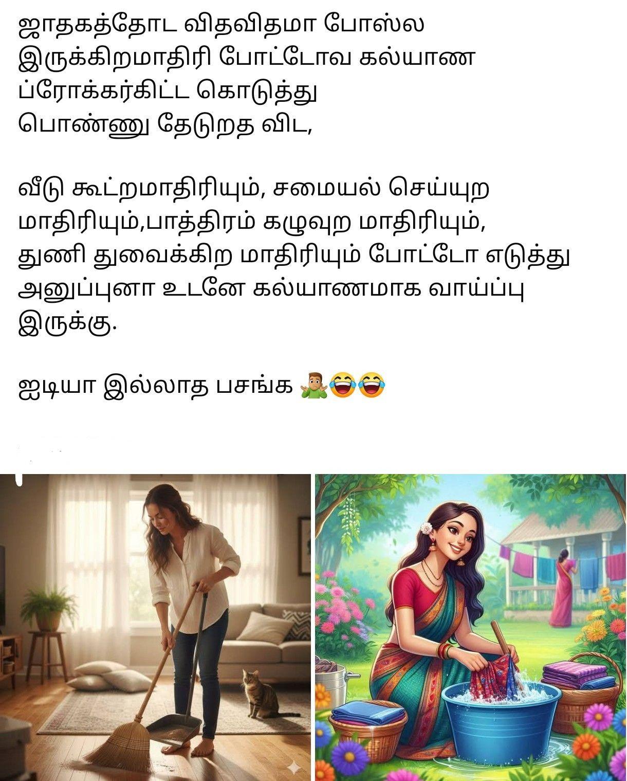 Facebookபுருஷனை சந்தேகப்பட்டு மனைவி ஒரு நாள் அவனோட மொபைல் போனை பரிசோதிச்சா... புருஷனோட Contact லிஸ்ட்ல Super Women, Sweet Heart, Dream Girl, Princess, Lovely Lady... இந்த பேரையெல்லாம் பார்த்து வெறி ஆயிட்டா.. இன்னைக்கு இவனை உண்டு இல்லைனு பண்ணிடலாம்ன்னு ஒவ்வொரு நம்பருக்கா கால் பண்ண ஆரம்பிச்சா.. முதல் நம்பருக்கு கால் பண்ணா அவனோட #அம்மா அட்டெண்ட் பண்ணாங்க.. ரெண்டாவது நம்பருக்கு கால் பண்ணா அவனோட #தங்கச்சி அட்டெண்ட் பண்ணிச்சு... மூணாவது நம்பருக்கு கால் பண்ணா அது (#மனைவி) அவளோட நம்பரு... நாலாவது நம்பருக்கு கால் பண்ணா அது #மகளோட நம்பரு... கடைசி நம்பருக்கு கால் பண்ணா #மாமியார் நம்பரு... மனம் நெகிழ்ந்து போன பொண்டாட்டி 'அப்பாவி புருஷனை சந்தேகப்பட்டுடோமே'ன்னு ரொம்ப வருத்தப்பட்டு புருஷனை கூப்பிட்டு மன்னிப்பு கேட்டு 5,000 டாலர் பணத்தையும் கொடுத்து "போன மாசம் பிரெண்ட்ஸ் கூட அவுட்டிங் போறேன்னு சொன்னீங்க.. நான் வேண்டாம்ன்னு சொல்லிட்டேன். இந்த வாரம் போய்ட்டு வாங்க"ன்னு வழி அனுப்பி வச்சா அந்த புண்ணியவதி.. வெளிய வந்த நம்மாளு #Mechanicன்னு save பண்ணி வச்சிருந்த அவன் #ஆளுக்கு கால் பண்ணி அவுட்டிங் போய்ட்டு வந்தான்... #Moral of The Story: இதுக்கு தான் சொல்றது Men Are Always Menன்னு... Facebook0 Comments ·0 Shares ·1K Views ·0 Reviews